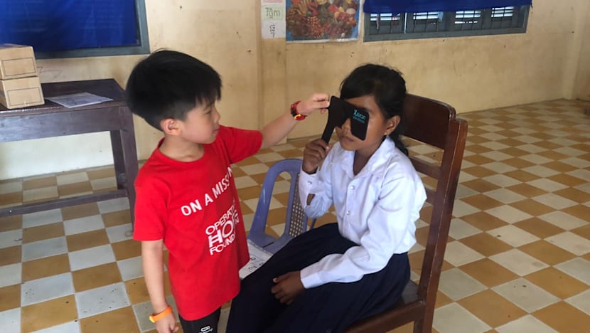 During Dr Pang’s most recent trip to Siem Reap, where she and other volunteers conducted eye screening for 400 schoolchildren, her older child, Nathanael Stuart Tan, helped by pointing at the letters on the vision chart. He also helped some children hold the occluder, a device used during vision screening.