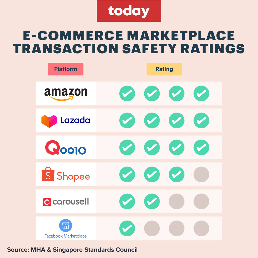 Rolled out on Saturday (May 14), the initial overall rankings gave the maximum four ticks to Lazada, Qoo10 and Amazon, while Facebook Marketplace received just one tick. Shopee got three ticks and Carousell got two ticks.