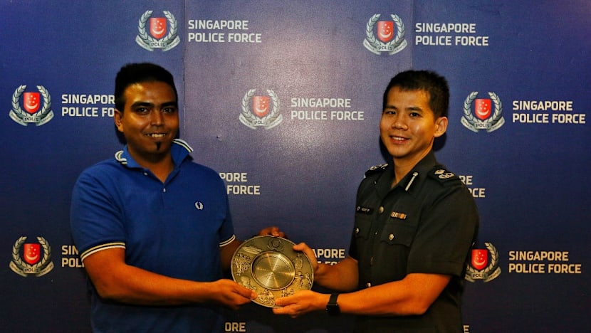 Mr Muhammad Talip Ajman Ali being awarded the Public-Spiritedness Award by AC Gregory Tan. Photo: Singapore Police Force