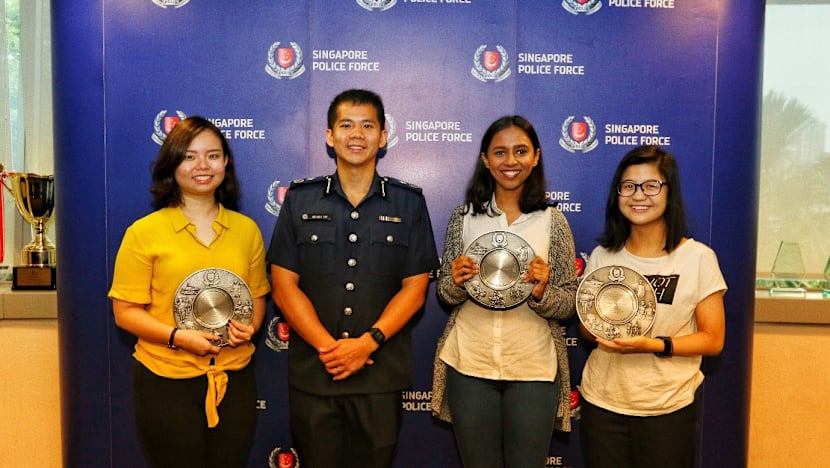 (From left to right) Ms Cheong Pei Lin Debbi, Ms Hemaa Shruthi Sekar, Ms Ng Rui Ashlynna being awarded the Public-Spiritedness Awards by AC Gregory Tan. Photo: Singapore Police Force