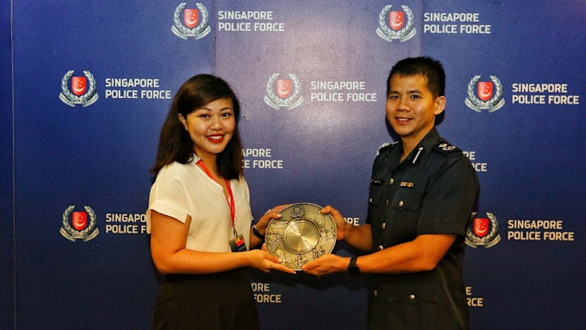 Ms Maria Leong being awarded the Public-Spiritedness Award by AC Gregory Tan. Photo: Singapore Police Force