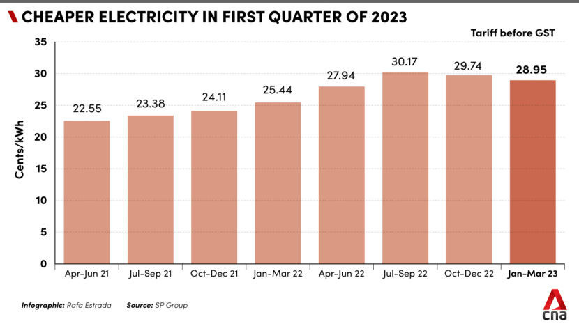 For households, the electricity tariff before GST will decrease from 29.74 cents to 28.95 cents per kWh from Jan 1 to Mar 31, 2023.