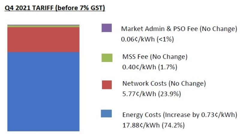 Excluding Goods and Services Tax (GST), the tariff for households will go up from 23.38 cents to 24.11 cents per kWh for the quarter ending Dec 31.