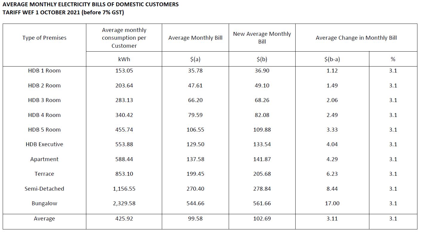 This means that the average monthly electricity bill for families living in Housing Board four-room flats will increase by S$2.49, before GST, said SP Group.