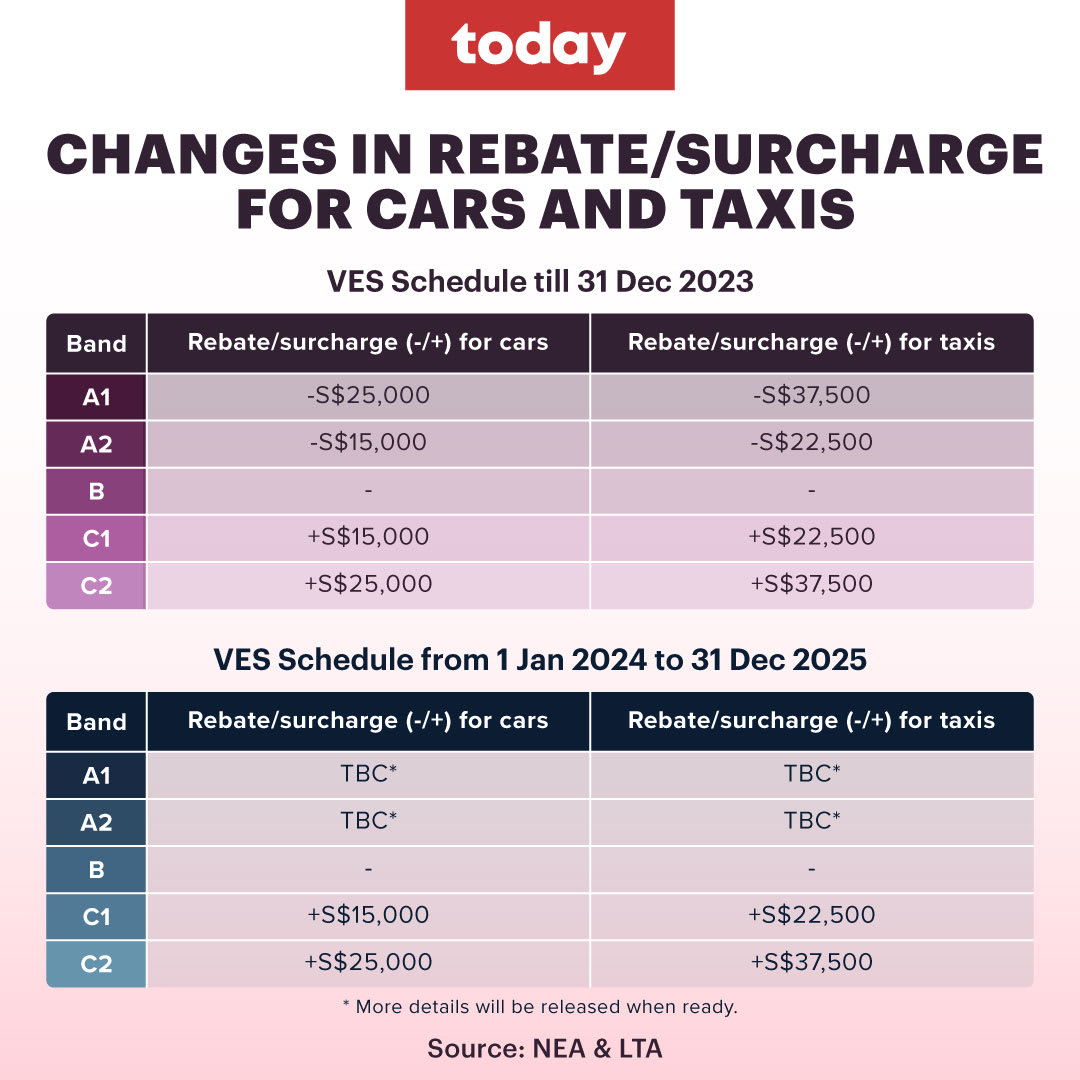Under the A1 band, car buyers are now entitled to a rebate of S$25,000, or S$37,500 for taxis. The amount applying from Jan 1, 2024 is yet to be announced.