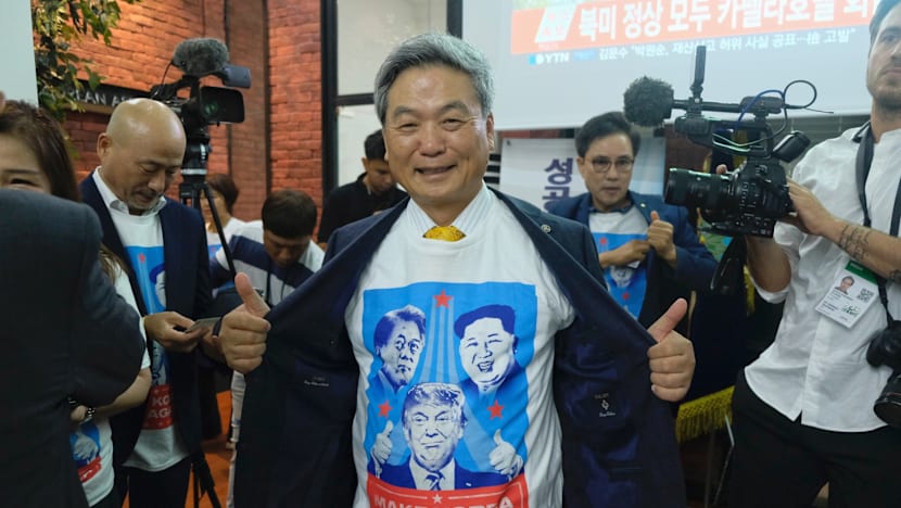 While waiting, they feasted on a spread of snacks and rice cakes. They also wore illustrated T-shirts specially printed for the event and featuring the faces of Mr Moon, Mr Kim and Mr Trump, with the slogan "Make Korea one again".