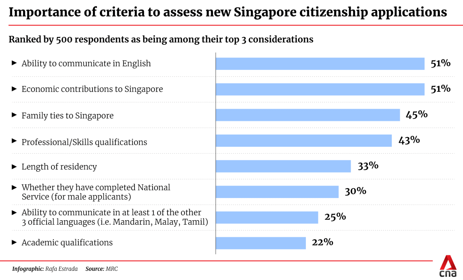 - The ability to communicate in English (51 per cent), economic contributions to Singapore (51 per cent) and family ties to Singapore (45 per cent) were ranked as the three most important criteria for new citizens
