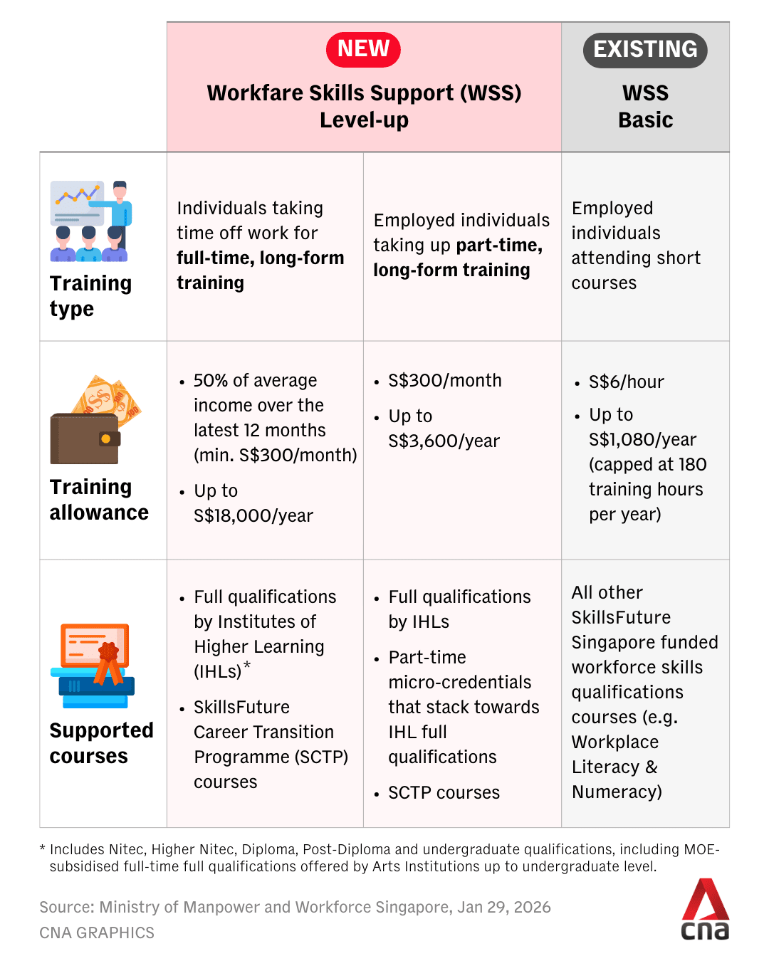 The scheme will also cover multiple periods of long-form training, said MOM and Workforce Singapore. Eligible workers can receive support for up to 24 months of long-form training completed before they turn 40, and another 24 months from the age of 40.