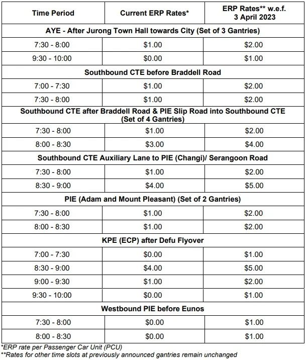 Rates for other previously announced timeslots and gantries remain unchanged, LTA said.