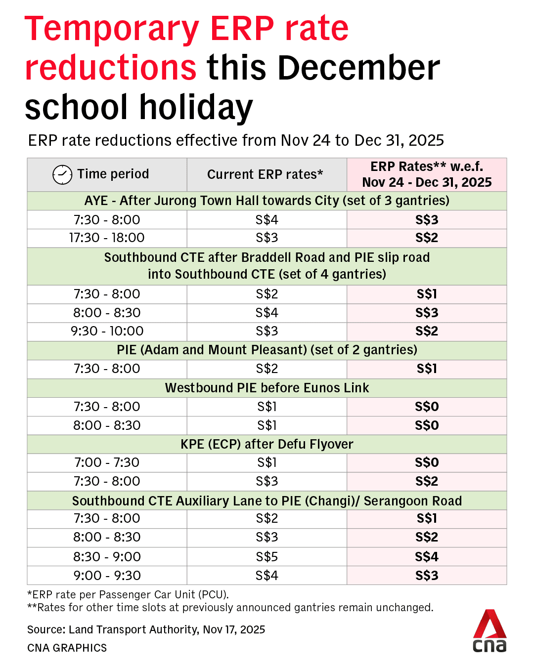 During the December school holiday period from Nov 24 to Dec 31, ERP rates will go down by S$1 at six locations.