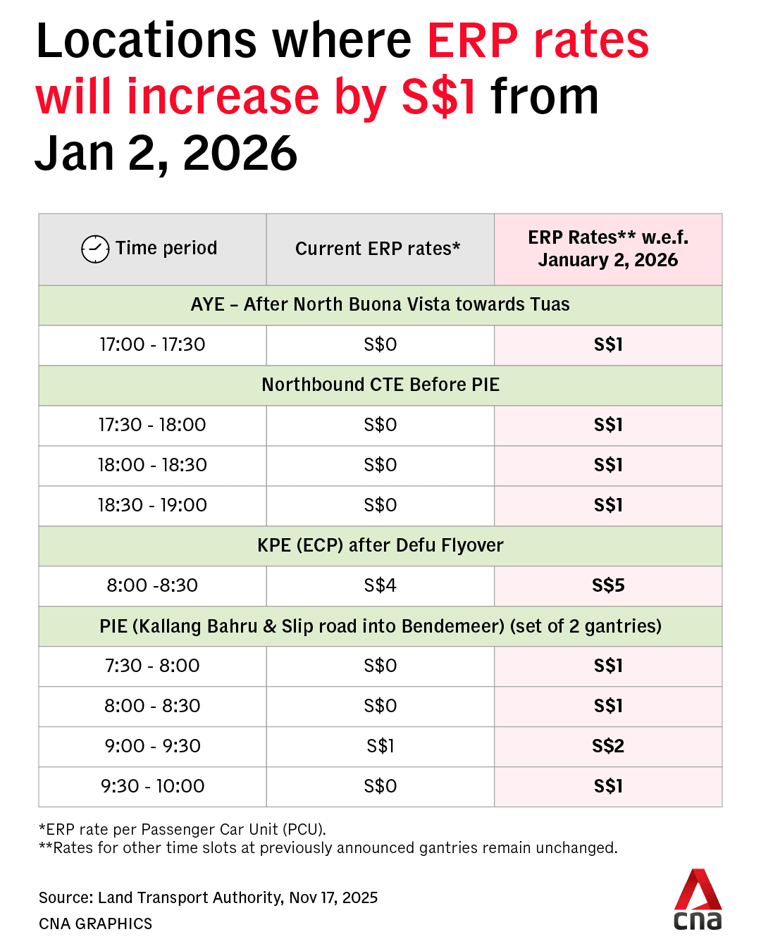 SINGAPORE: Electronic Road Pricing (ERP) rates at four expressway locations will go up by S$1 (US$0.78) from Jan 2, 2026.