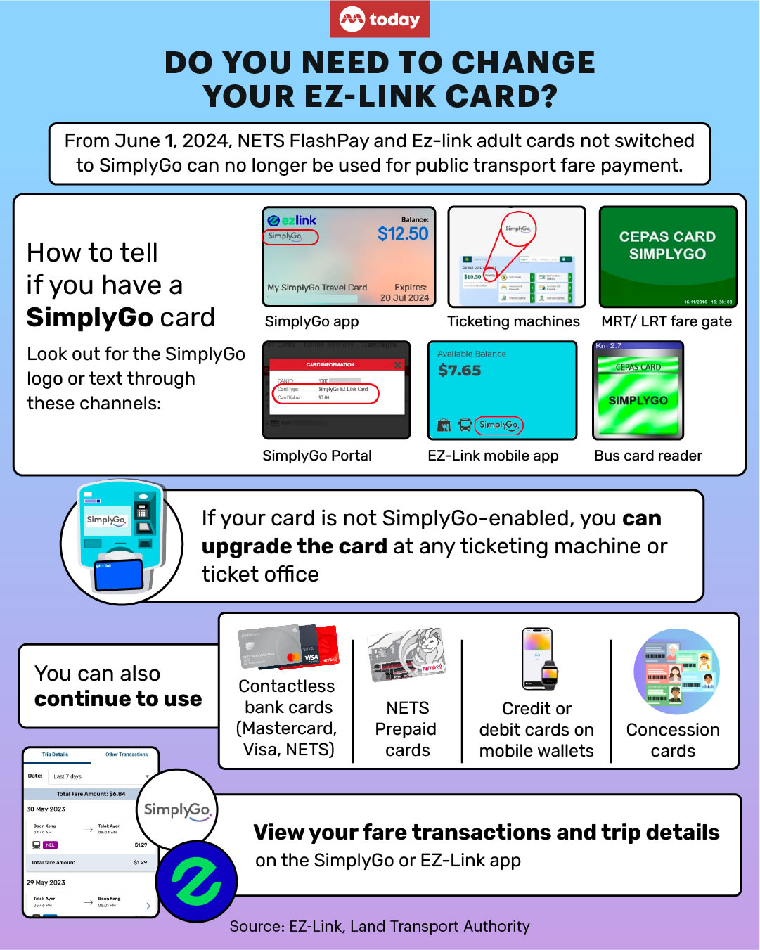 Nets FlashPay cards will continue to be accepted for retail payments, Ez-link cards that are not upgraded to SimplyGo Ez-link will not be accepted by merchants from June 1 onwards.