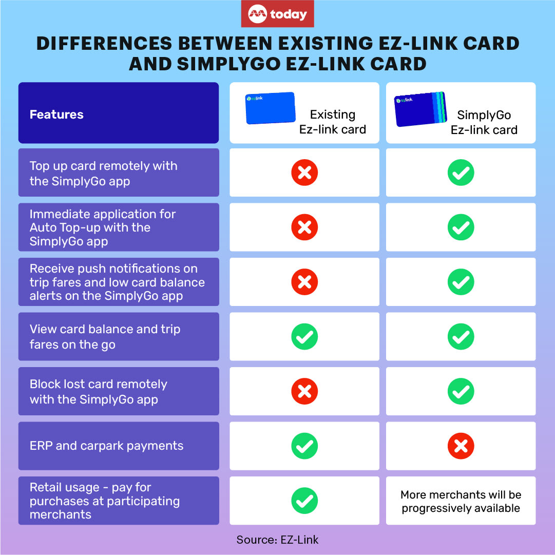 SimplyGo Ez-link cards cannot be used to pay for Electronic Road Pricing (ERP) charges and car-park fees, unlike old Ez-link cards that can also be used for motoring payments.