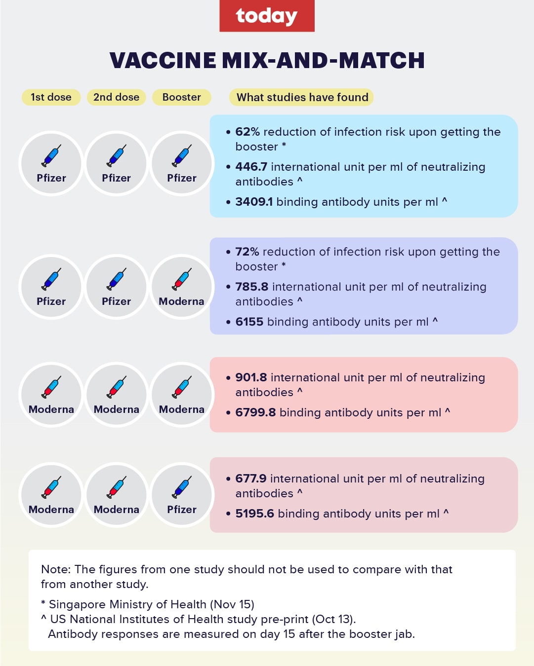 On Monday (Nov 15), Health Minister Ong Ye Kung said MOH found that for people who have taken two doses of the Pfizer-BioNTech vaccine, a Moderna booster dose can reduce the risk of infection more effectively than another dose of Pfizer.