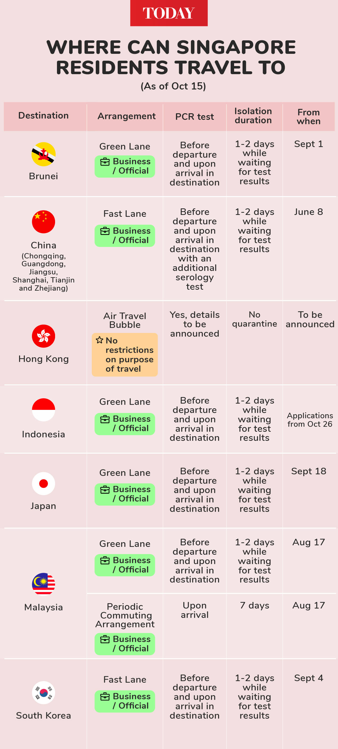 The RGL agreement allows people that have stayed in Singapore or these countries for 14 days to travel between them for business or official reasons for up to 14 days. For people travelling from Singapore to Indonesia, applications start on Oct 26. Applications have opened for Brunei, Japan and Malaysia.