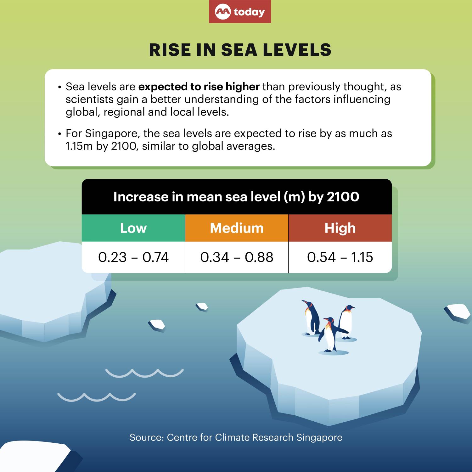 - In the best case, Singapore's mean sea level will go up between 0.23m and 0.74m