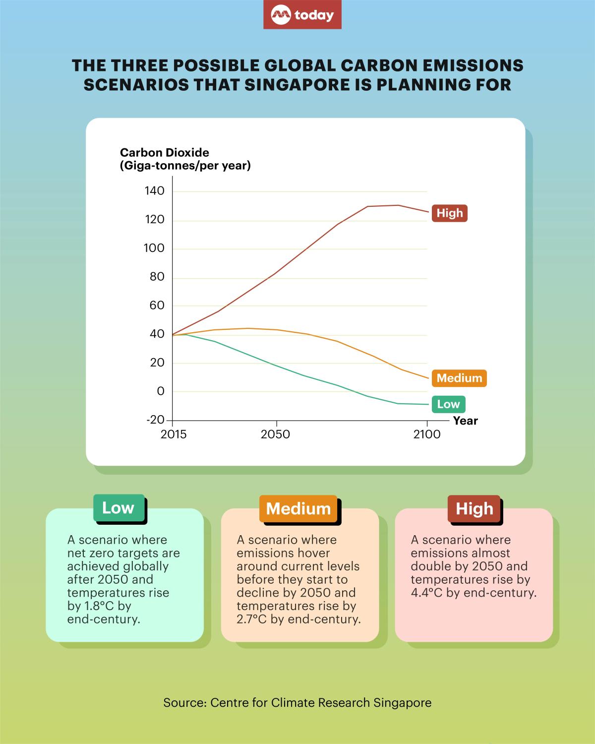 Should global emissions almost double by 2050 under the worst-case scenario, for example, Singapore's average temperatures could shoot up by 0.55°C per decade, among other possible impacts.
