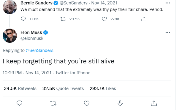 He had previously also replied to a tweet by US Senator Bernie Sanders calling for more tax on the rich with "I keep forgetting that you’re still alive", sparking backlash from Twitter users who felt the the tweet was too disrespectful.