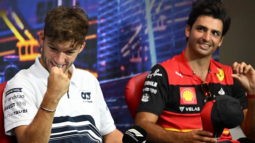 (From left) Formula One drivers Valtteri Bottas from Alfa Romeo, Sergio Perez from Red Bull, Lance Stroll from Aston Martin, Pierre Gasly from AlphaTauri and Carlos Sainz from Ferrari attending a pre-event press conference on Sept 29, 2022 for the Formula One Singapore Grand Prix.