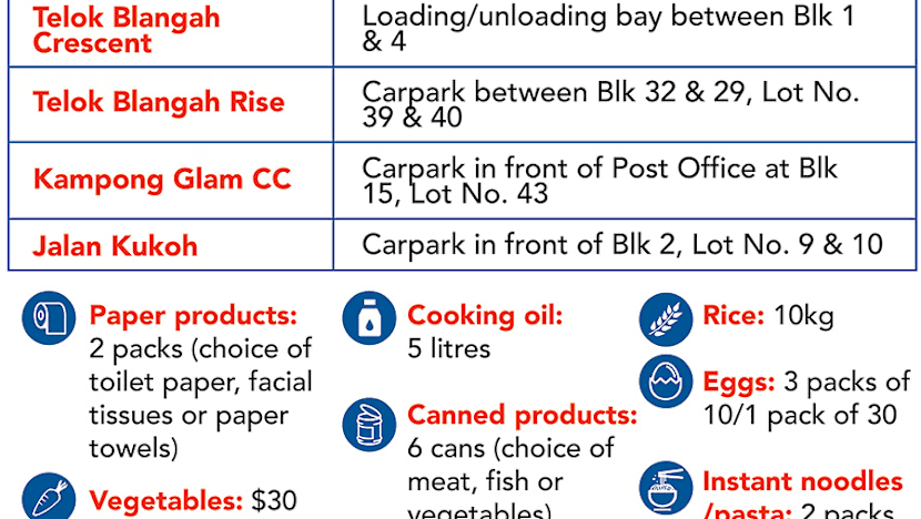 From Thursday (April 23), a FairPrice van will stop by five locations — at Commonwealth Link, Telok Blangah Crescent, Telok Blangah Rise, Kampong Glam Community Club and Jalan Kukoh — from 9am to 2pm daily.