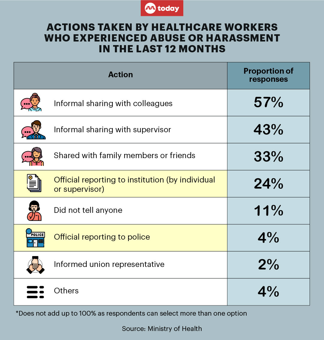 SINGAPORE — Rather than make an official report, a majority of healthcare workers who suffer abuse or harassment at work would casually bring up the incident with their colleagues, while around two in five would do so with their supervisor on an informal basis.