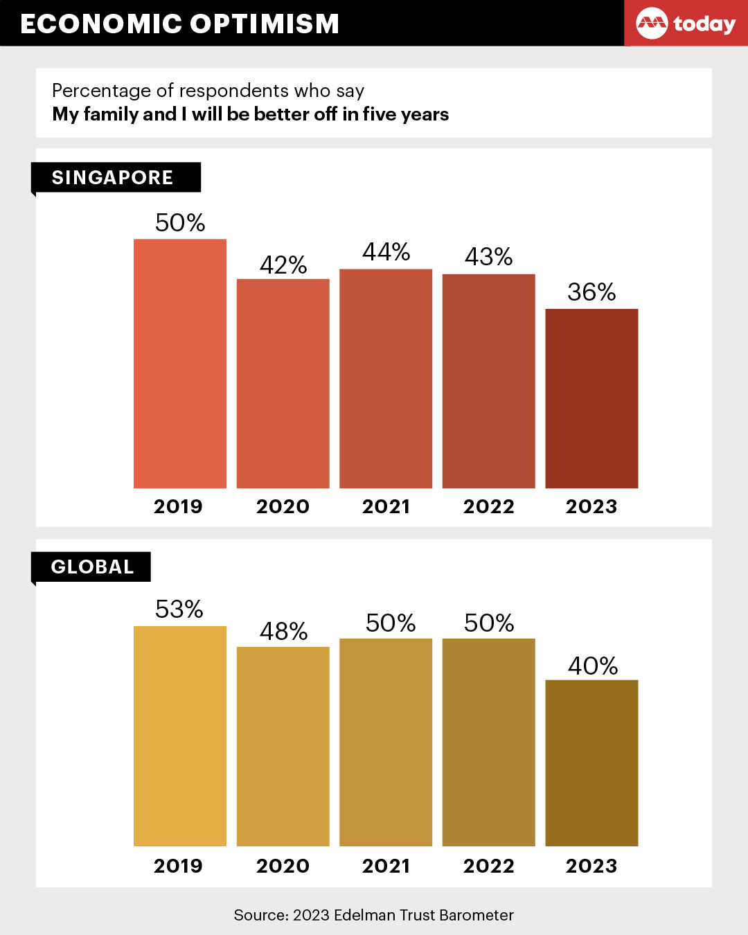 For the 2023 report, 36 per cent of the respondents in Singapore picked either of the top two alternatives, indicating optimism. This was down from 43 per cent in 2022 and 44 per cent in 2021.