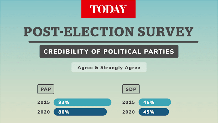 PAP was still seen as the most credible among the political parties, although there was a 7-percentage-point slide from 93 per cent in 2015 to 86 per cent in 2020 in the respondents who agreed or strongly agreed that it was credible.