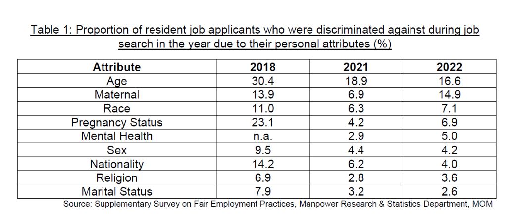 "While age discrimination remained the main form of discrimination towards job seekers, the proportion of job seekers who experienced age discrimination declined, from 18.9 per cent in 2021 to 16.6 per cent in 2022," MOM said.