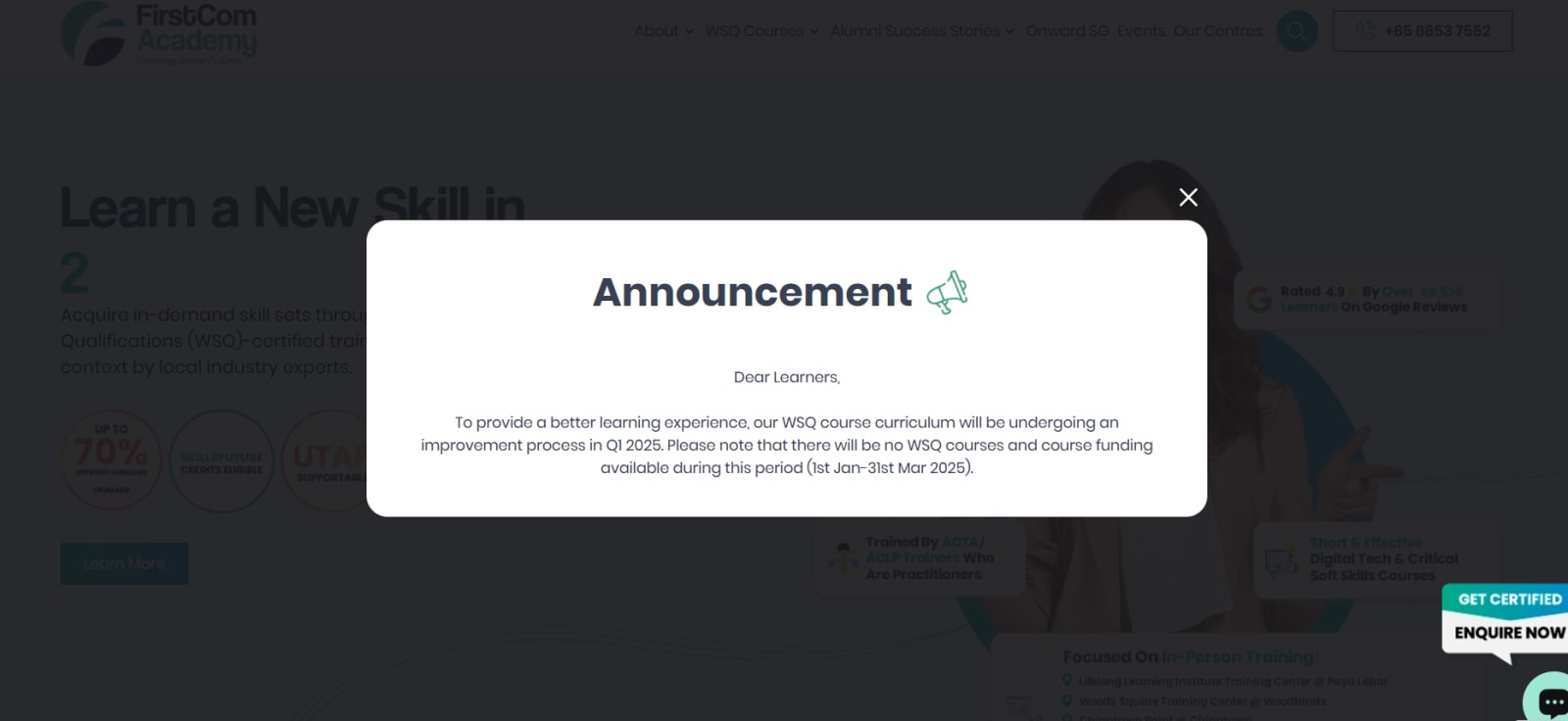 The onus is on FirstCom Academy to inform affected learners that they will not receive the funding subsidies for their courses, and that they will be unable to attain the WSQ Statement of Attainment, which is awarded upon completion of each WSQ course.