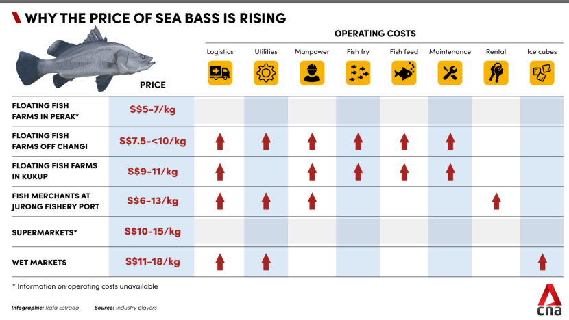 These reasons, coupled with rising fuel prices, meant Mr Ee has had to raise the price of his sea bass to S$11/kg from S$9/kg last October.
