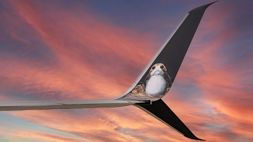 Aptly unveiled on May the 4th this year, Alaska Airlines’ creatively named Star Wars Transport to Disneyland Resort has livery depicting the Millennium Falcon in a dogfight with TIE fighters. It also has porgs on its wingtips.
