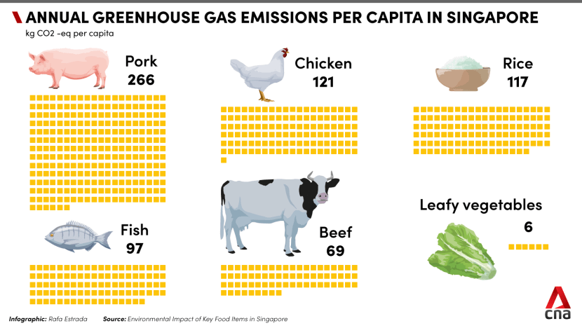 The study also said that at the time, 29 per cent of the average Singaporean’s diet consists of meats, eggs and seafood. The study noted that meat products such as pork have significantly higher greenhouse gas than fruits and vegetables.