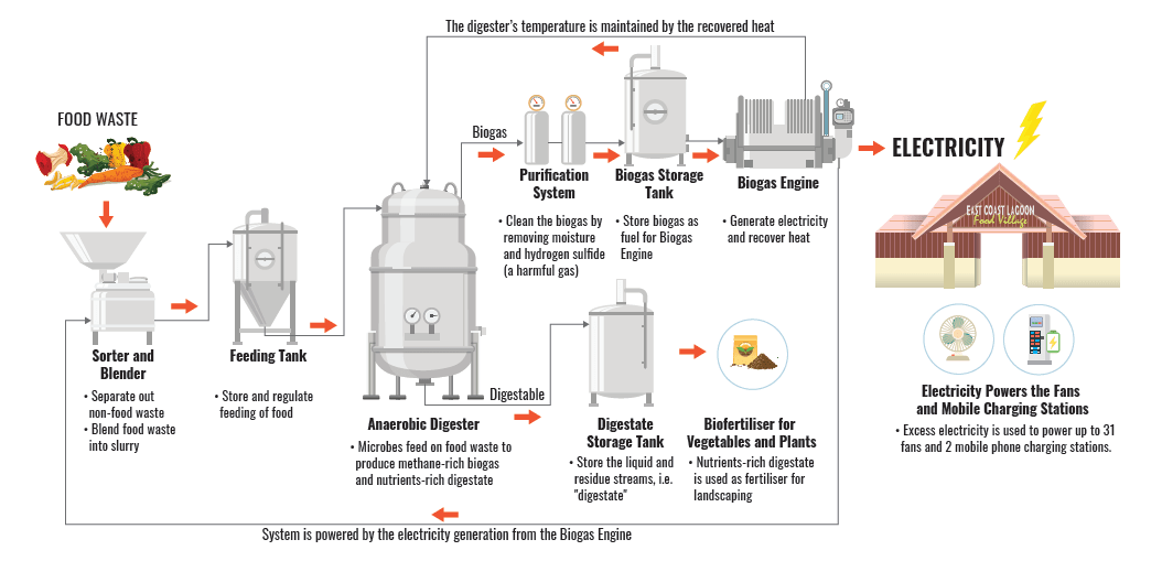 The electricity will be used to power the digestion system itself, as well as two mobile phone charging stations for the public. Excess electricity can also be used to power up to 31 wall-mounted fans at East Coast Lagoon Food Village.