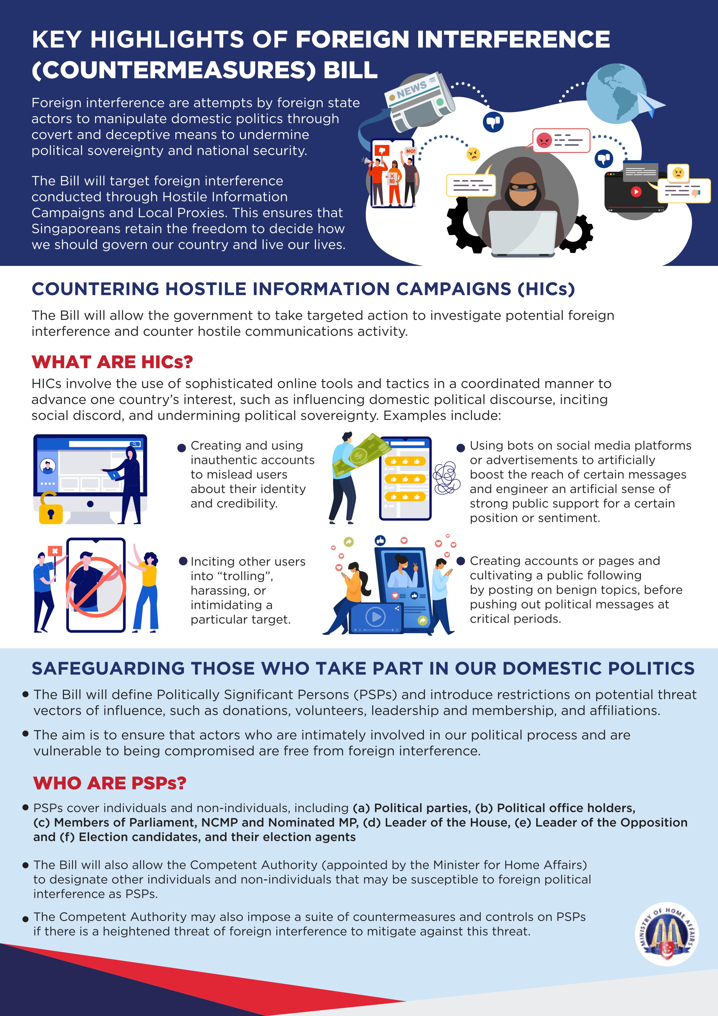 The Foreign Interference (Countermeasures) Act will give the Minister for Home Affairs the power to take down content deemed to be part of a hostile information campaign, MHA said in a news release.