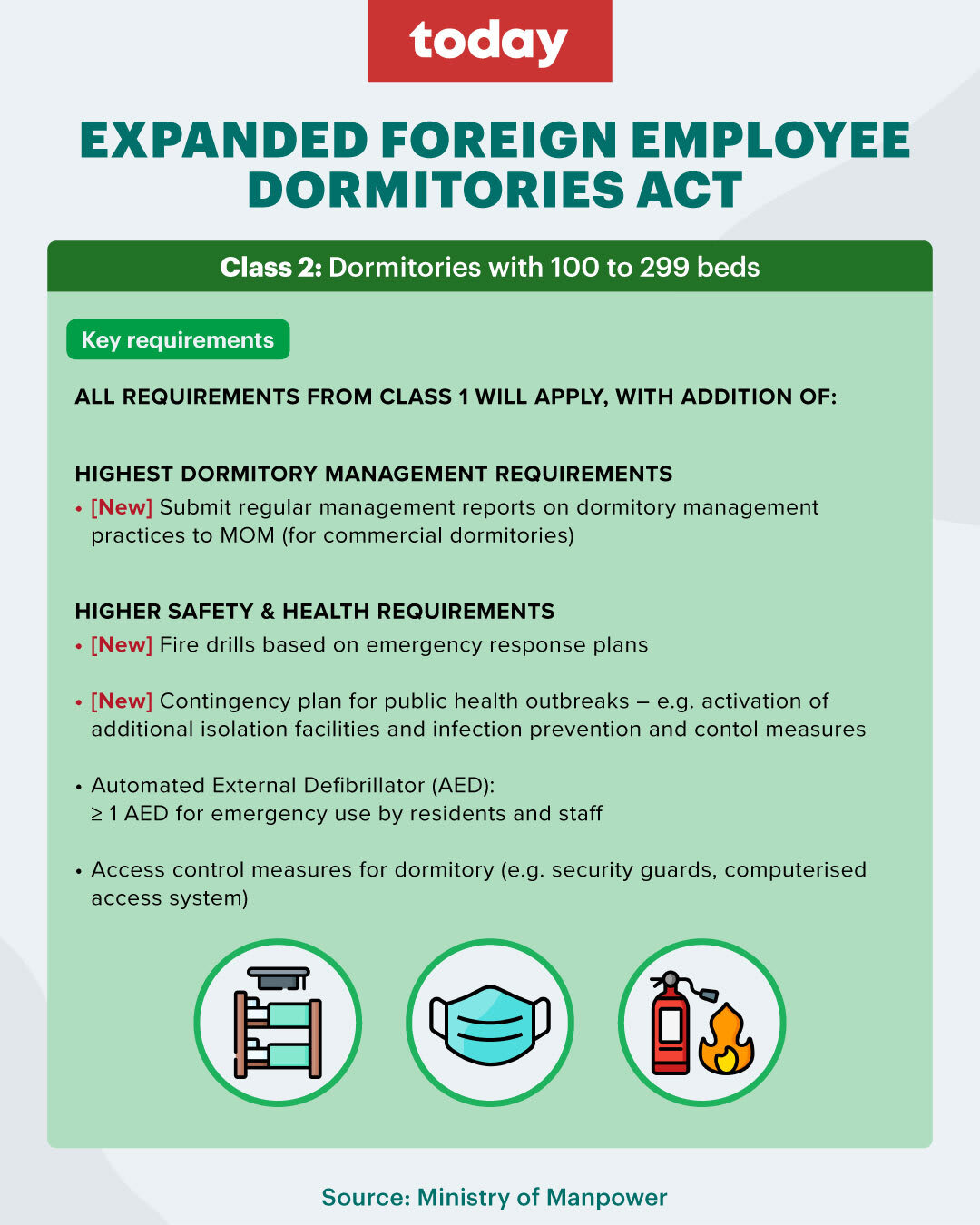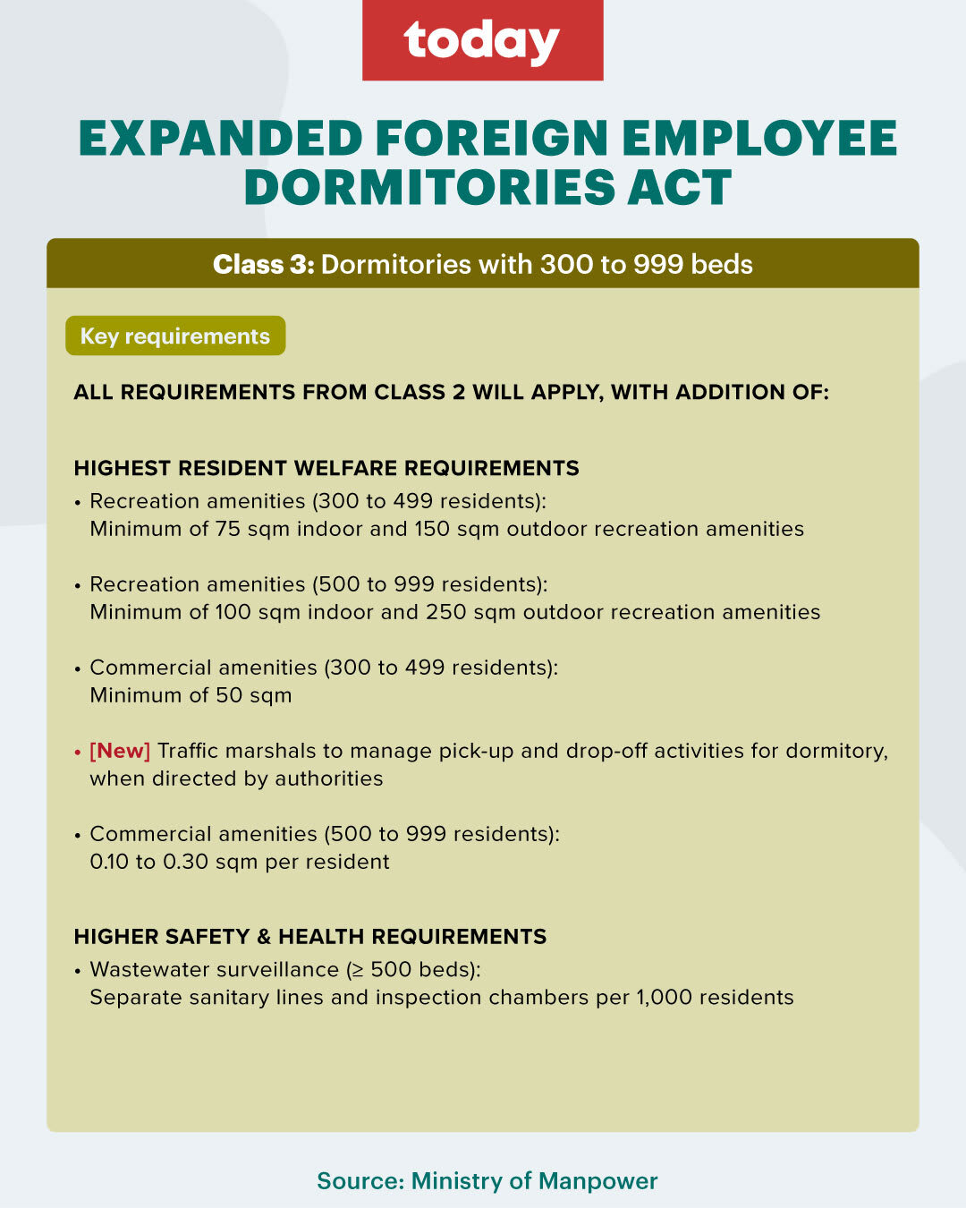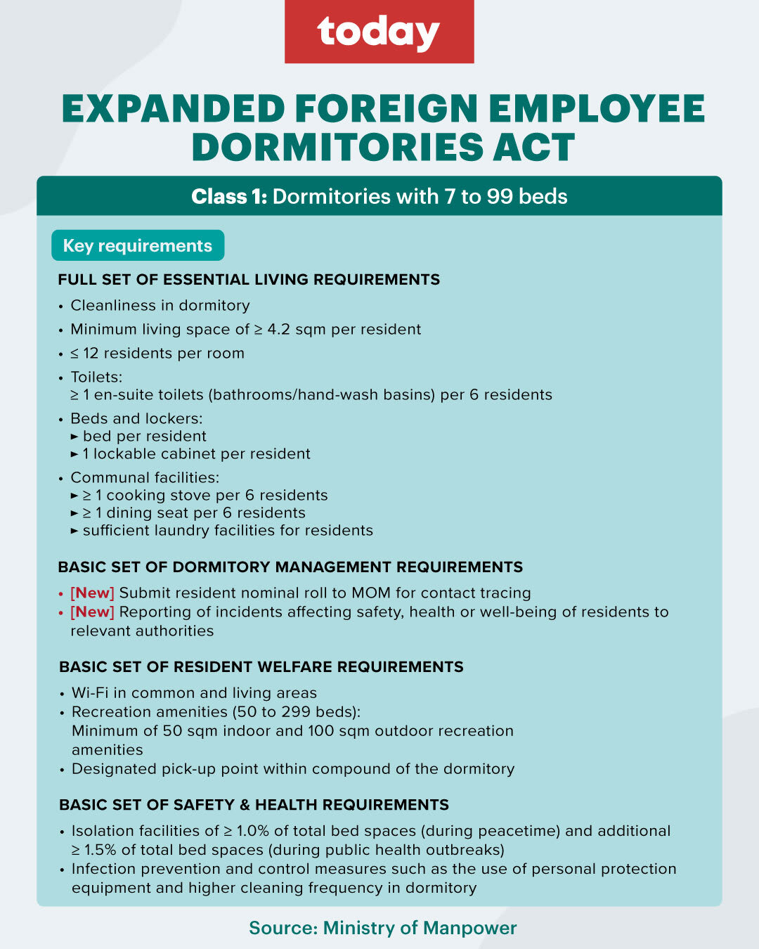 There will be no changes in requirements for Class Four dormitories, MOM said, but all other classes will be subject to new requirements in areas such as reporting requirements, traffic management and contingency plans for public health outbreaks.
