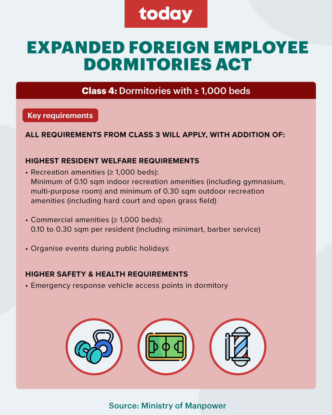 Currently, all migrant worker dormitories are subject to various requirements under various pieces of legislation, covering areas such as fire safety, living conditions, sanitary and public health requirements, MOM said.