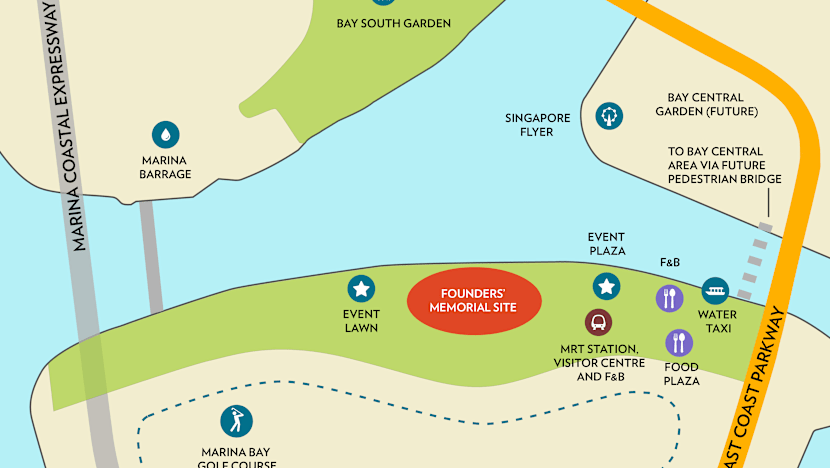 The area surrounding the memorial will include the new MRT station, a new pedestrian bridge linking the area around the F1 Pit Building to Bay Garden East, as well as a water-taxi stop. There will be various amenities such as food outlets and an event plaza.