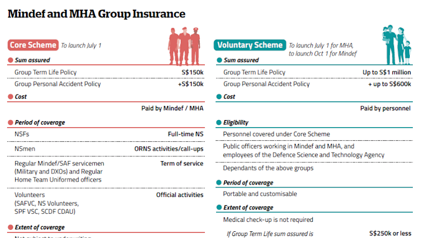 Besides national servicemen, Mindef and SAF regulars and Home Team uniformed officers will also receive group term life and group personal accident insurance coverage during their period of service.