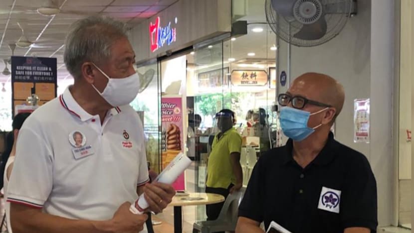 Singapore Democratic Party’s candidate for Bukit Panjang SMC, Dr Paul Tambyah, bumped into Mr Liang Eng Hwa during a walkabout on July 1, 2020.