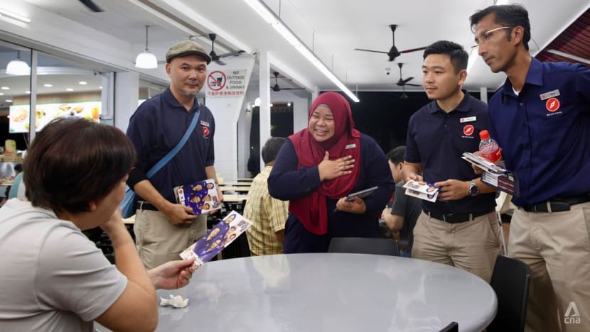Red Dot United's (left to right) Sharon Lin, Ravi Philemon, and David Foo speaking to diners at an eatery along Upper Thomson road on Apr 25, 2025. (Photo: CNA/Raj Nadarajan)