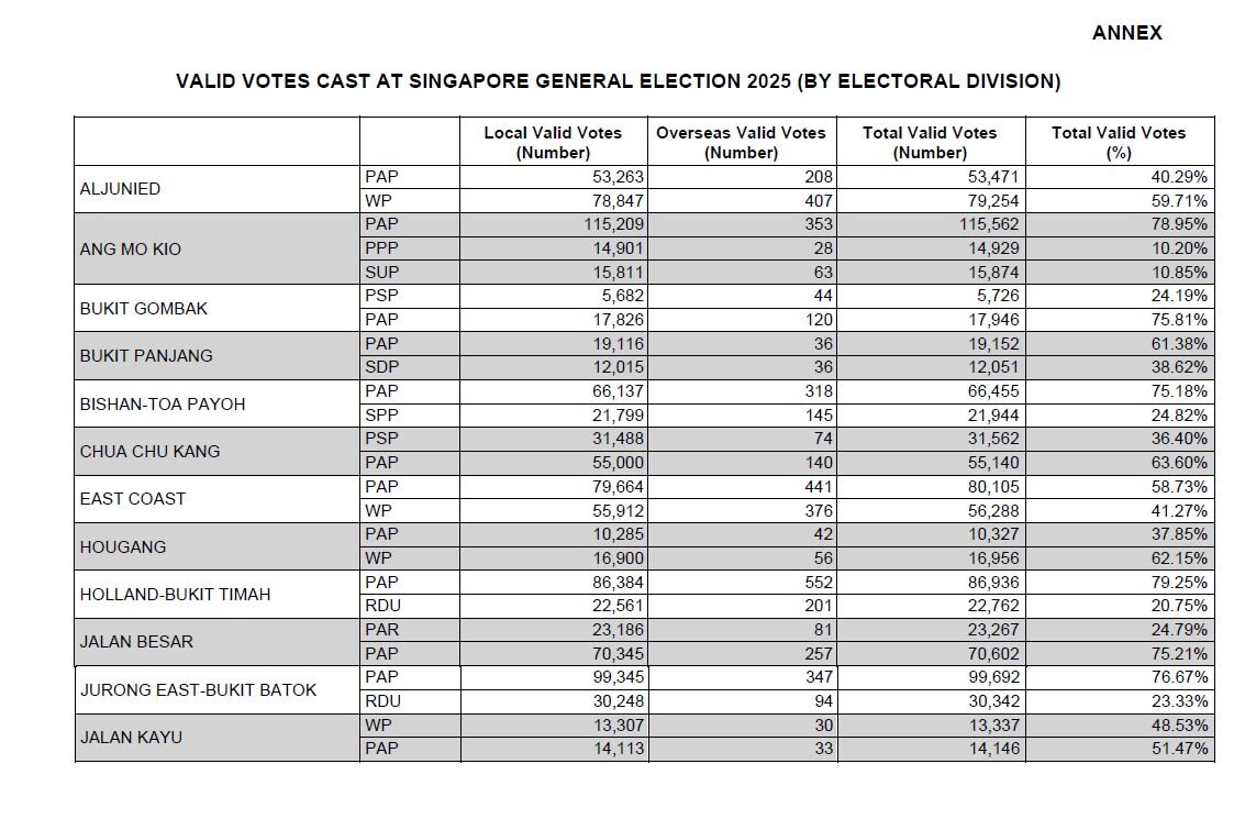 The Workers' Party received more valid overseas votes than the PAP in Aljunied GRC, Sengkang GRC and Hougang SMC, which they retained. They ended the 2025 polls as the only opposition party to be elected to parliament.