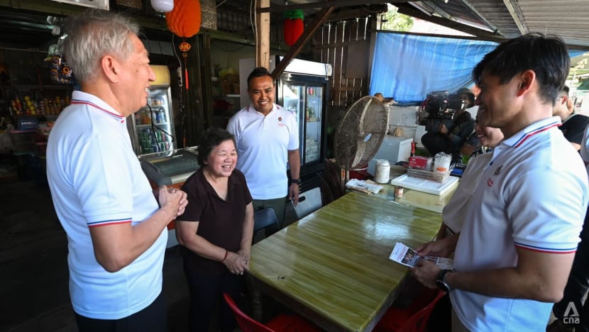 Members of the People's Action Party (PAP) speak to a resident at Pulau Ubin during their walkabout on Apr 11, 2025. (Photo: CNA/Syamil Sapari)