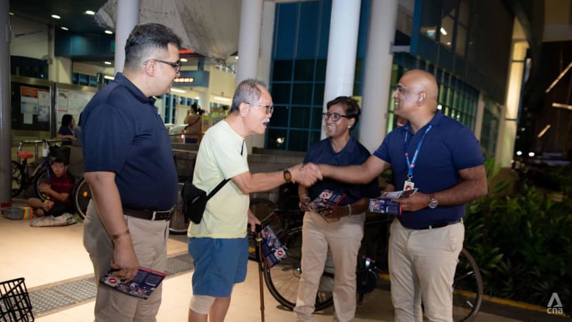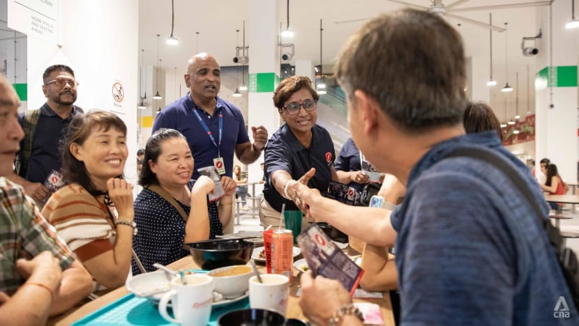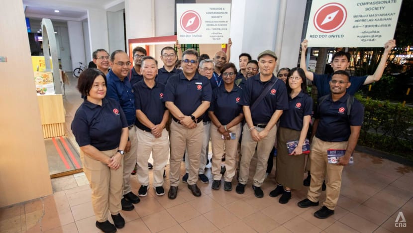 Red Dot United members and volunteers during a walkabout at Fernvale Hawker Centre and Market on Mar 21, 2025. (Photo: CNA/Ili Nadhirah Mansor)