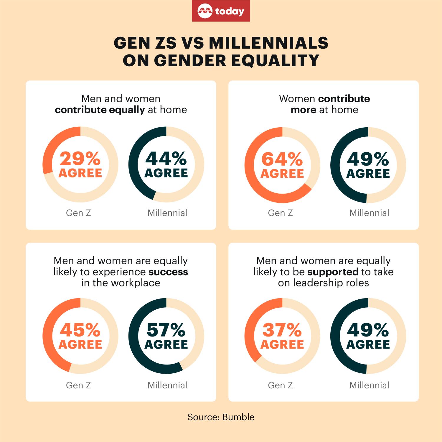 - Only 29 per cent of Gen Zers agree that men and women contribute equally at home, as compared with 44 per cent of millennials