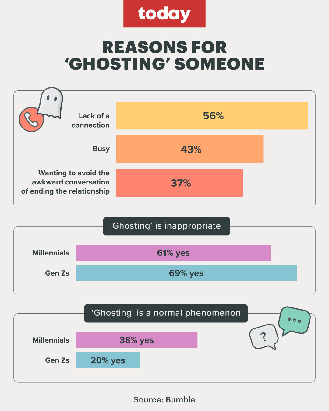 Millennials (60 per cent) are also more likely than Gen Zers (51 per cent) to ghost someone due to a lack of connection.