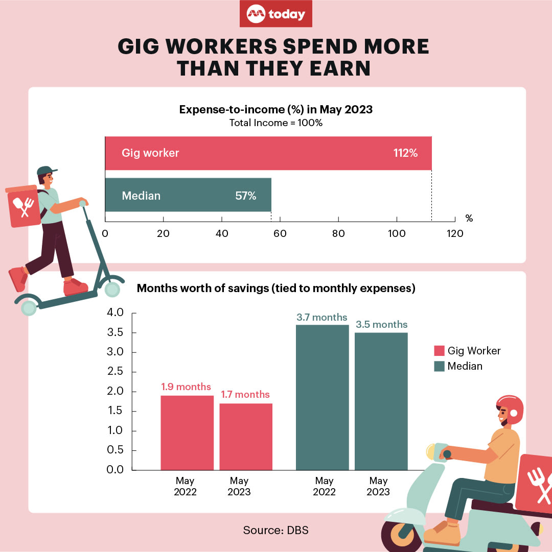 But that would not last long, typically, as the DBS study found that the median gig worker has only enough savings to cover about 1.7 months of expenses should he stop working.