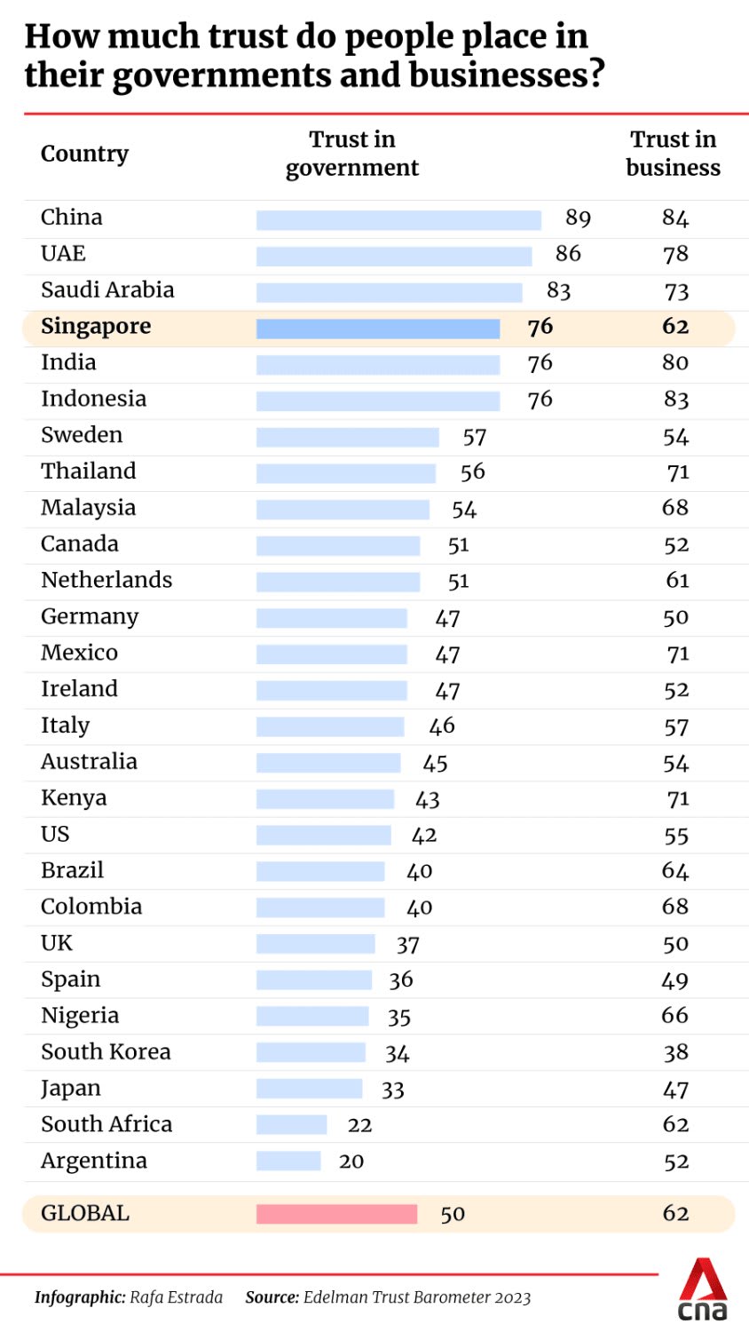 Globally, Singapore is one of six countries where there were high trust for governments: The others were China (89 per cent), United Arab Emirates (86 per cent), Saudi Arabi (83 per cent), India (76 per cent) and Indonesia (76 per cent).