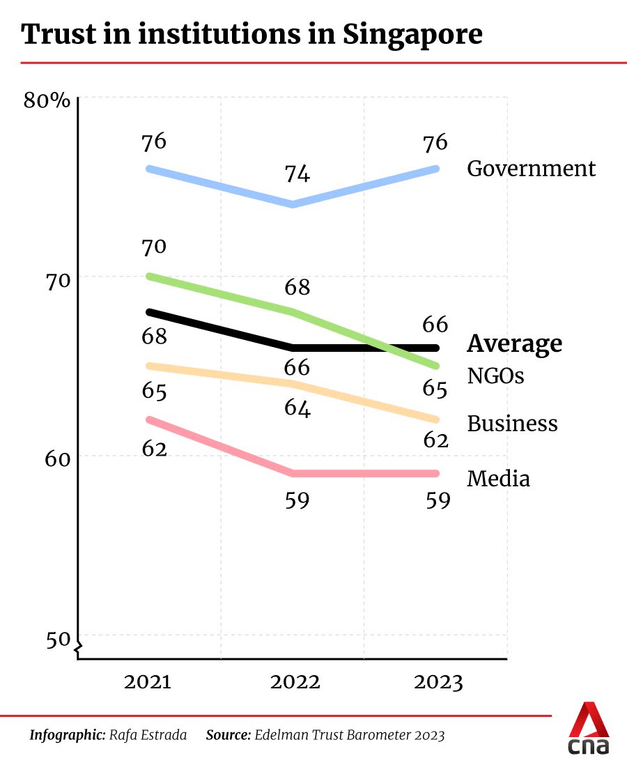 This was followed by NGOs (65 per cent), business (62 per cent) and media (59 per cent). The overall trust index for Singapore, which is calculated as an average of the four trust scores, stood at 66 per cent, unchanged from last year.Trust in government in Singapore as measured by the survey has been consistently high — 76 per cent in 2021 and 74 per cent in 2022.