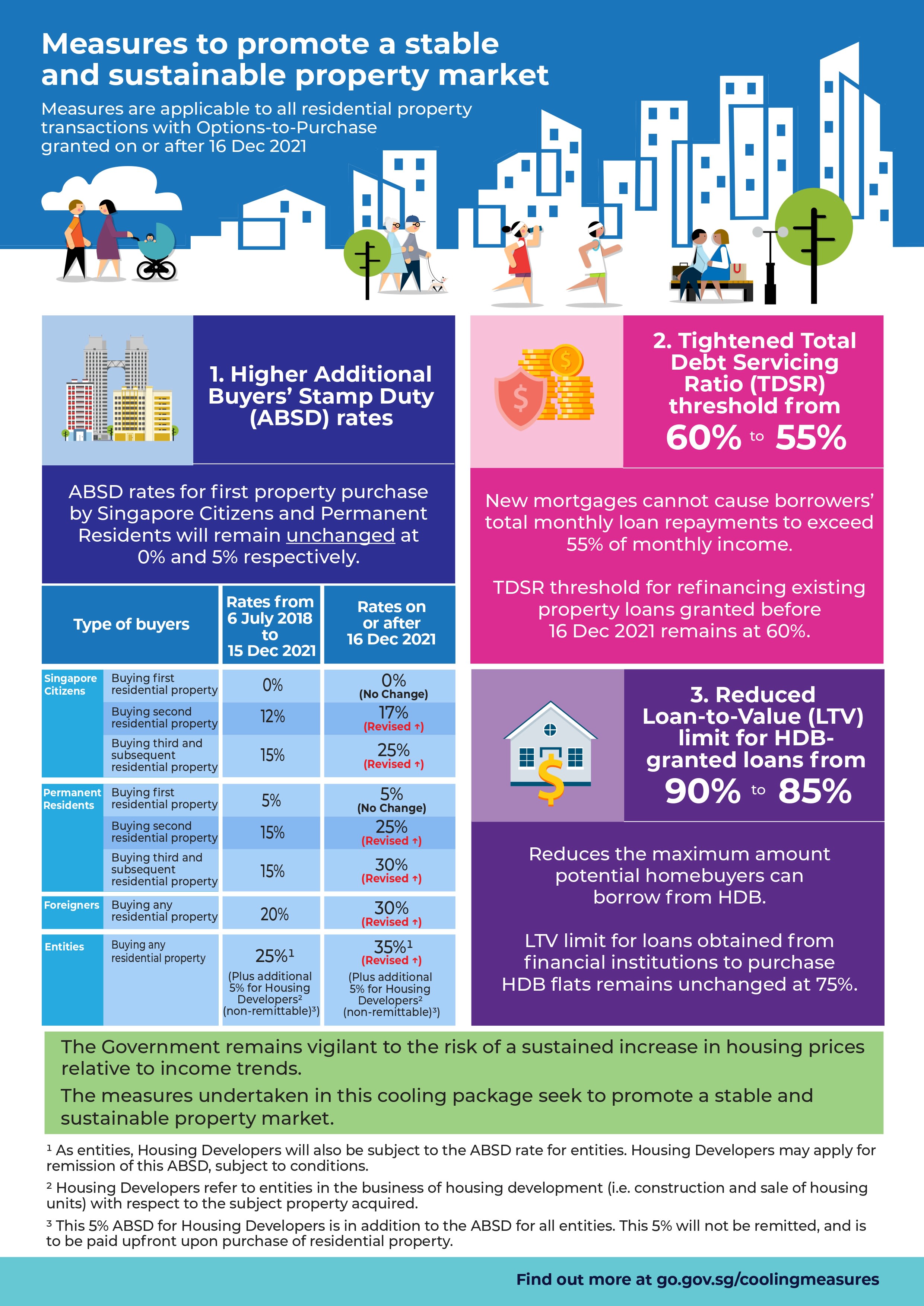 SINGAPORE — In a bid to cool the housing market, the loan-to-value limits for home buyers taking a property loan from the Housing and Development Board (HDB) will be tightened, and the Additional Buyer's Stamp Duty (ABSD) for the purchase of private properties will increase, the Government announced at about 11.30pm on Wednesday (Dec 15).