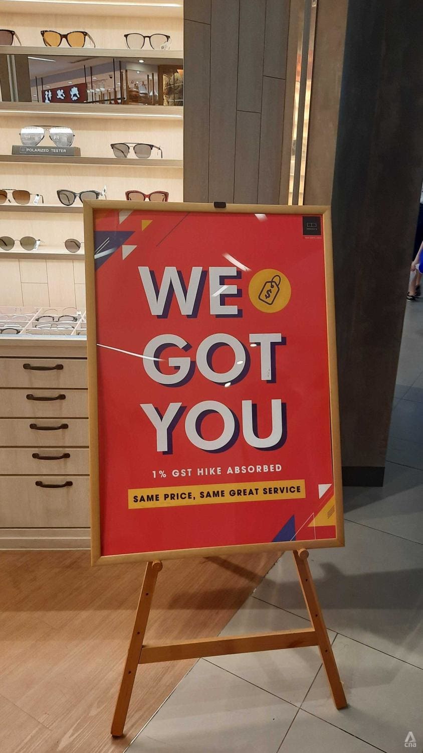 A sign spotted outside an Owndays outlet read: “We got you. 1% GST hike absorbed. Same price, same great service.”